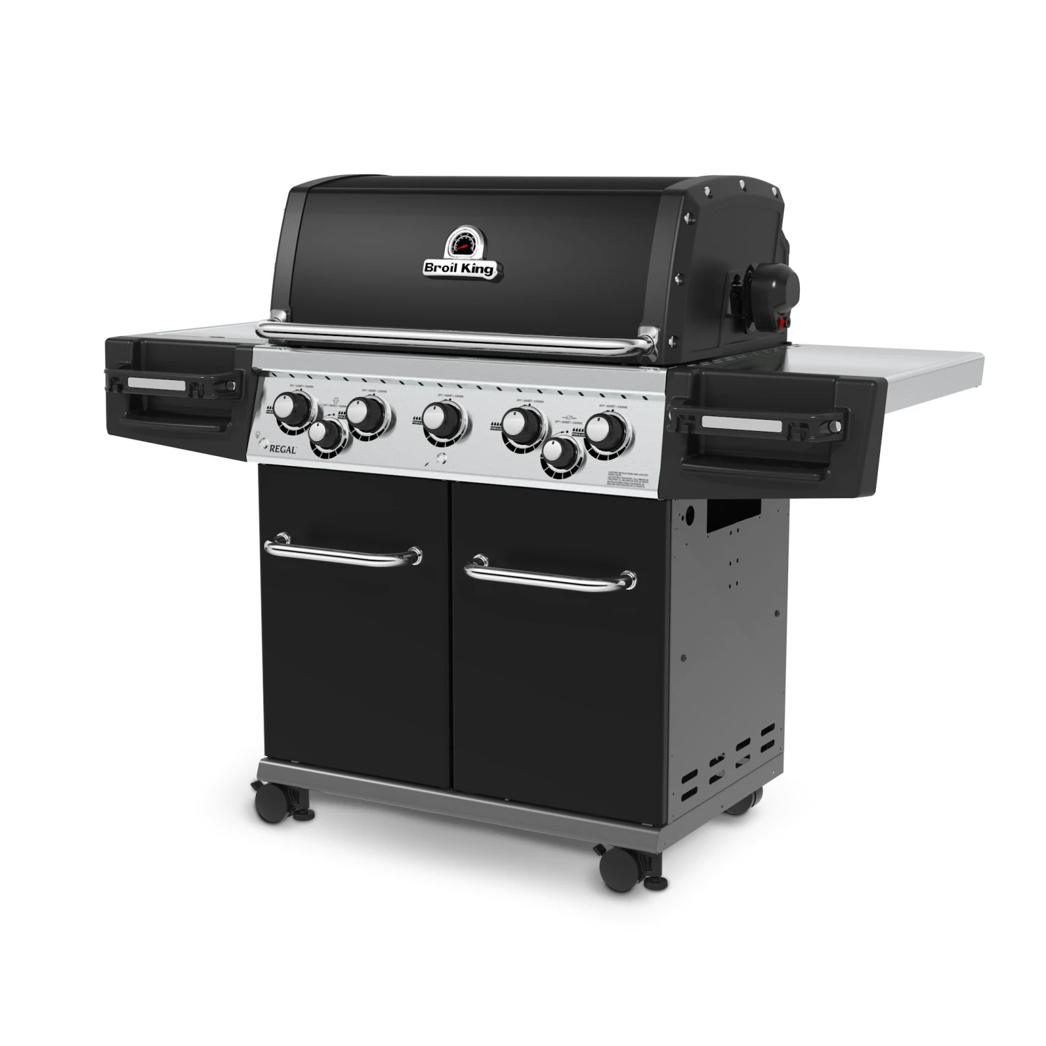 Der Regal 590 verfügt über eine sehr große Grillfläche, die mit massiven gusseisernen Grillrosten ausgestattet ist. Weiterhin ist der Grill mit 5 Edelstahl Dual-Tube Brennern, Flav-R-Waves, einem geschlossenen Unterwagen, Edelstahlseitenablagen, sowie einer LED-Knopfbeleuchtung ausgerüstet. Die Türen sind in schwarz lackiert und der doppelwandige Deckel ist schwarz emailliert.